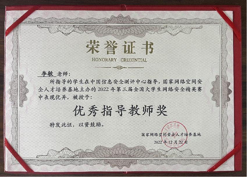 第三届全国大学生网络安全精英赛由中国信息安全测评中心指导,在国家网络空间安全人才培养基地主办及河南新工科产业学院承办下,特地为在本次比赛中优秀组织单位、优秀指导教师及获奖学员颁发相关荣誉证书!